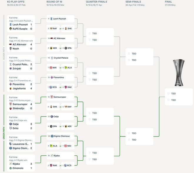北京時(shí)間2月27日,本賽季歐協(xié)聯(lián)淘汰賽附加賽的比賽已全部結(jié)束。在兩回合較量后,采列、佛羅倫薩、里耶卡、薩姆松體育、水晶宮、奧洛莫茨、阿爾克馬爾、波茲南萊赫八家俱樂(lè)部最終闖進(jìn)淘汰賽。